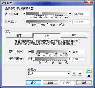 在调整过程中,我们要用到Goldwave的“时间弯曲”效果和“批处理”功能。首先,打开一个待处理的音频文件,选择“效果”—“时间弯曲”,切换到“类似”选项,并从下方的“预置”中选择“默认”(在“预置”菜单中,Goldwave已经为我们提供了几个预置选项,此处选择“默认”是为了将我们用于批处理的效果存入其中)。