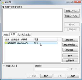 最后,打开“文件”—“批处理”,向其中添加需要批量更改的文件,再切换至“处理”选项卡,从“添加效果”中选择上一步中设定好的“时间弯曲 — 默认”并将其添加,最后在“文件夹”里设置修改后的文件的保存方式,就可以点击“开始”来进行批处理了。