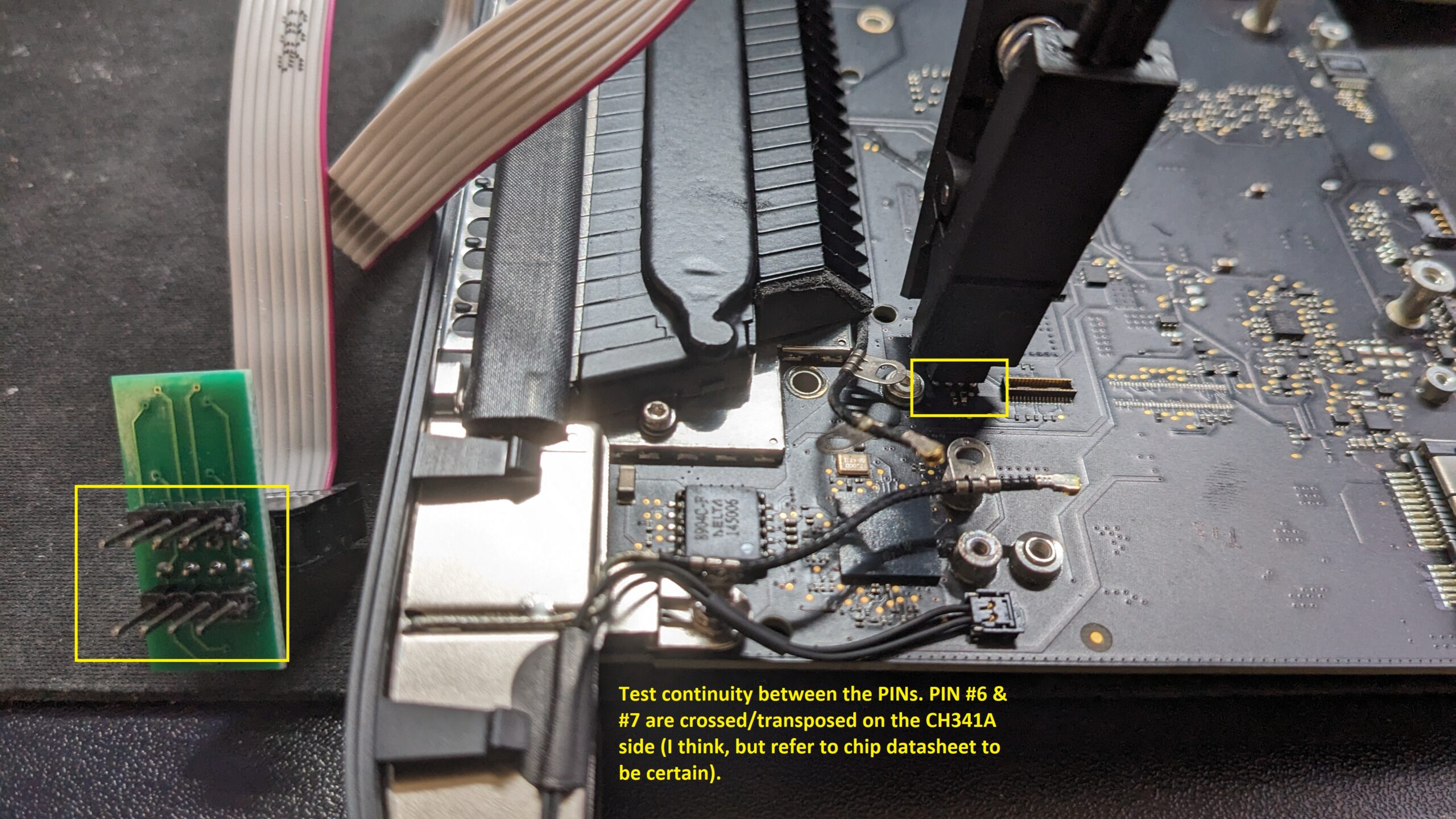 - See the closeup pictures from the gallery below, the purple wire should match PIN #1 on the chip, and when it’s clipped to CH341A, PIN #1 faces toward the lever, away from the USB port.